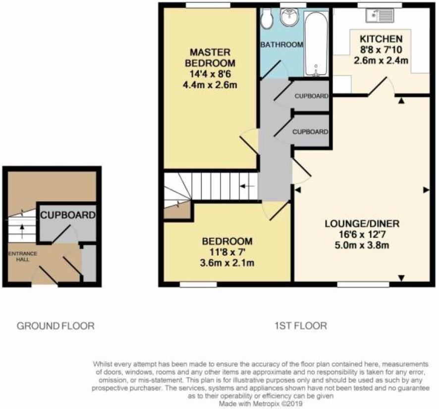Landing, two storage cupboards (one housing water cylinder), lounge/diner, two bedrooms, bathroom, kitchen