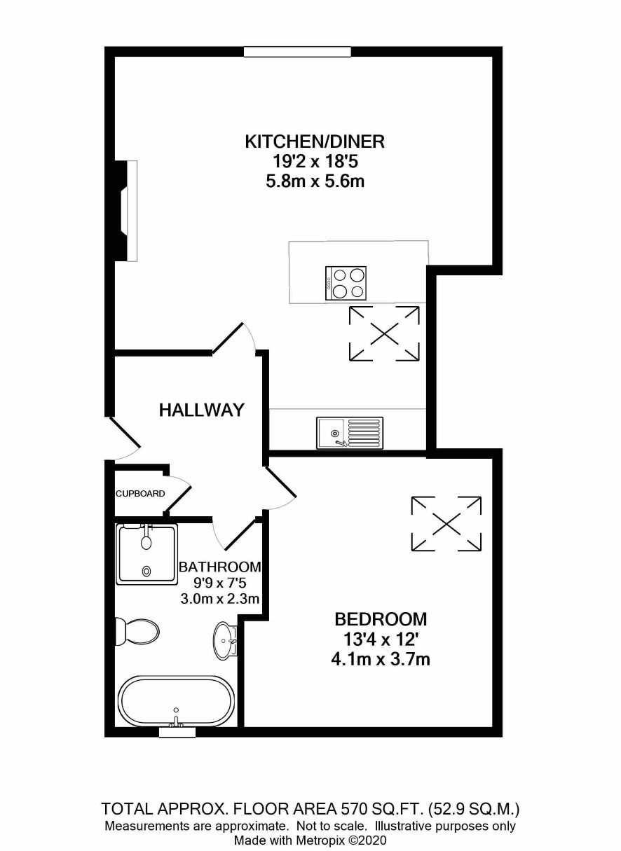 Hall, open plan sitting room with kitchen area, bedroom and bathroom
