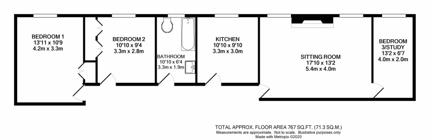 Communal hall, hall, sitting room, study/bedroom 3, kitchen, two bedrooms, bathroom