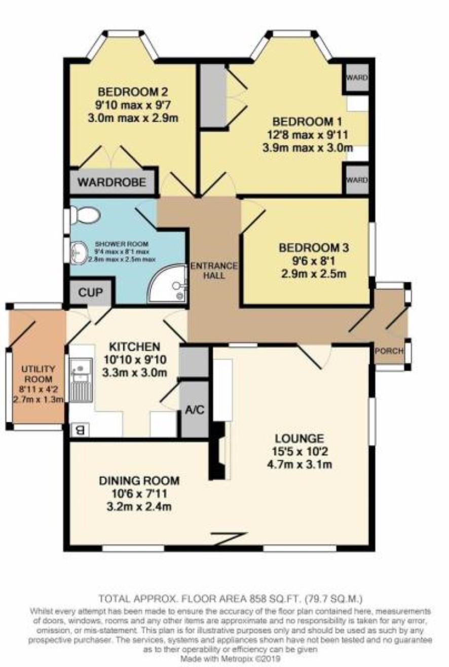 Entrance porch, entrance hall, living room, dining room, kitchen, rear porch, three bedrooms, shower room.