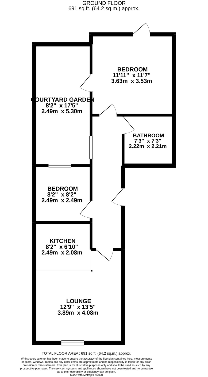 Shared entrance hall, door to private hallway, lounge with kitchen area, 2 bedrooms, bathroom