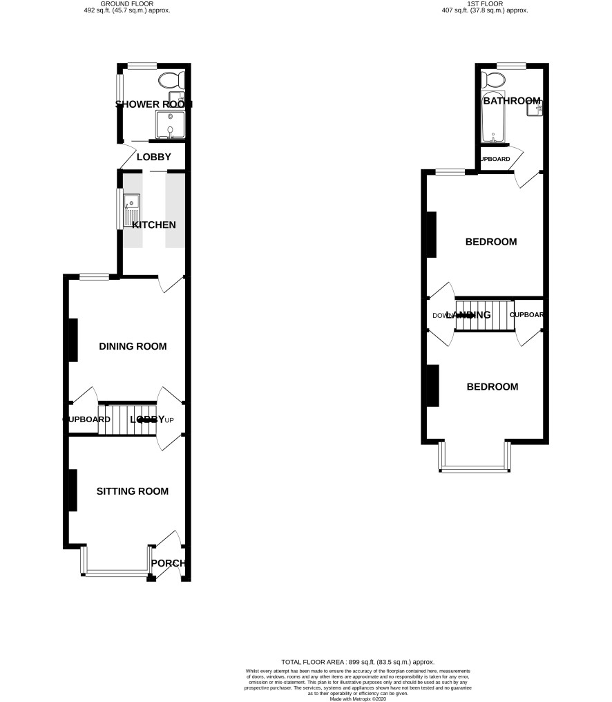 Ground floor: porch, sitting room, dining room, rear lobby, kitchen, shower room and wc First floor: two bedrooms, bathroom Outside: Small front garden, enclosed rear garden in need of attention, mainly laid to lawn with patio area.