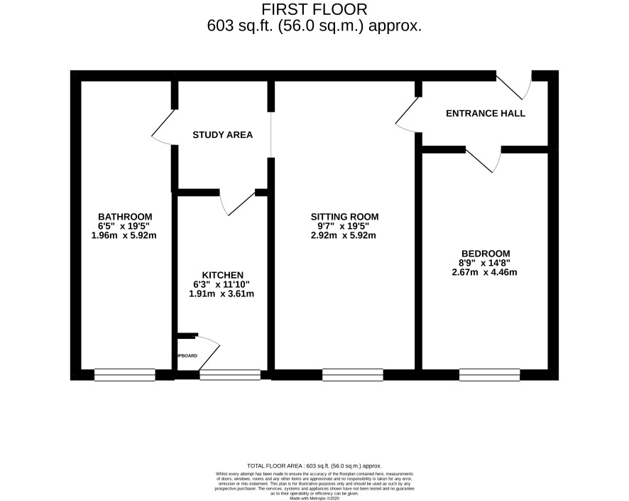 Entrance hall, bedroom, sitting room / dining room, study area, kitchen, bathroom
