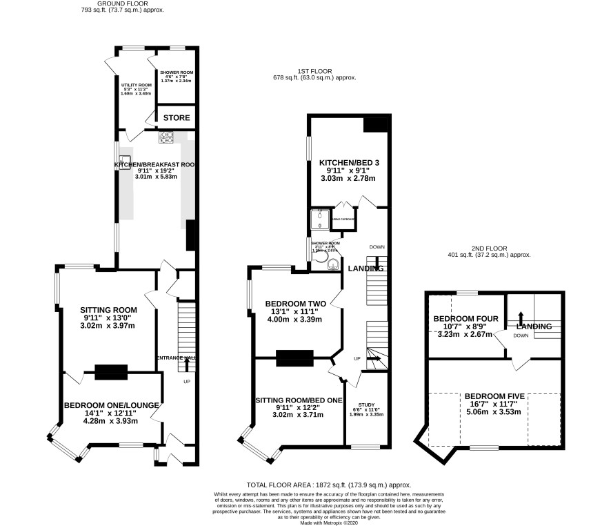Landing, sitting room/bedroom 1, Bedroom 2, study/bedroom 3, kitchen/bedroom 4, shower room.