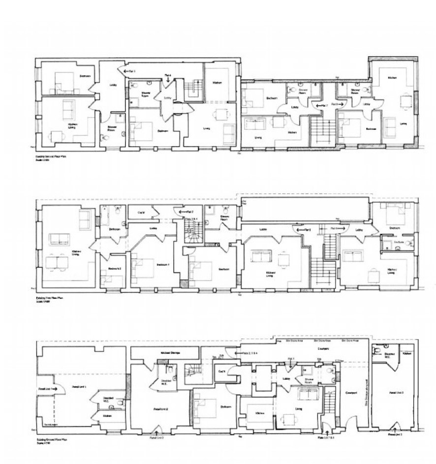Ground Floor: 3 lock up shops, one bedroom flat, Lobby and access to cellar and upper floors. First Floor: 2 one bedroom flats and a two bedroom flat. Second Floor: 4 one bedroom flats.
