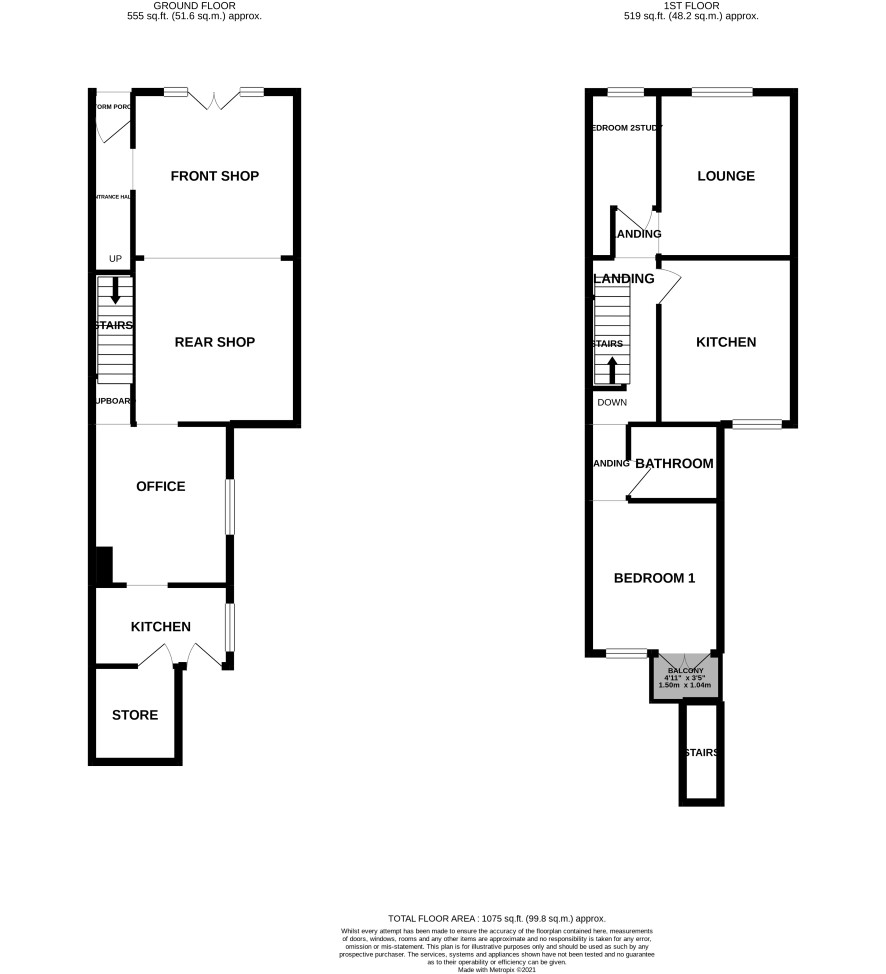 Ground floor shop: main shop area, office, store Flat: Ground floor: entrance hall First Floor: Landing, two bedrooms, bathroom, kitchen, sitting room, wooden balcony Outside: front area, rear garden in need of attention with wooden outbuilding and outside wc, potential off road parking space subject to the necessary consents