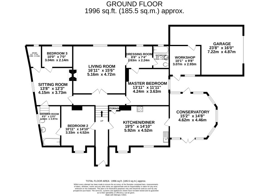 Entrance hall, living room, kitchen/dining room, sitting room, study, 3 bedrooms, dressing room, bathroom, conservatory.