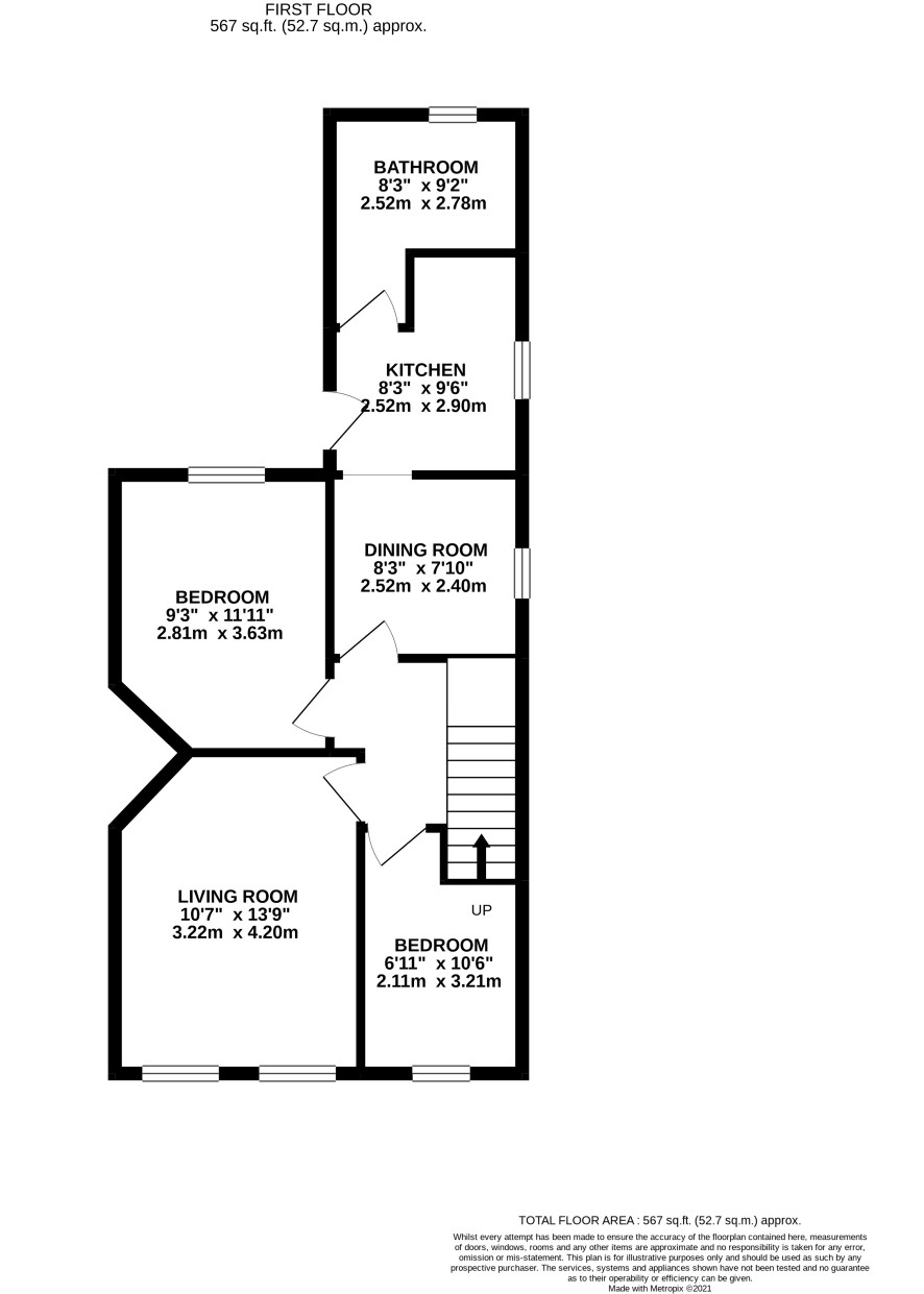 Stairs leading to first floor landing, living room, dining area, kitchen, two bedrooms, bathroom