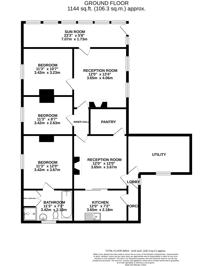 Porch, kitchen, dining room, sitting room, scullery, pantry, three bedrooms, bathroom, sun room