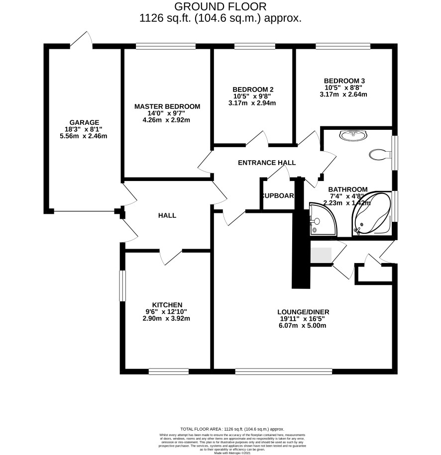 Entrance hall, kitchen, inner hall, L-shaped lounge/dining room, three bedrooms, bathroom, side hall.