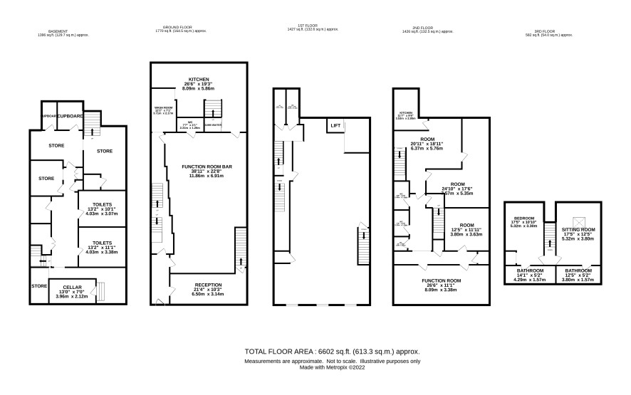 Entrance with stairs to further floors, function room, w.c., dishwasher/prep room, kitchen, dummy waiter, stairs to basement