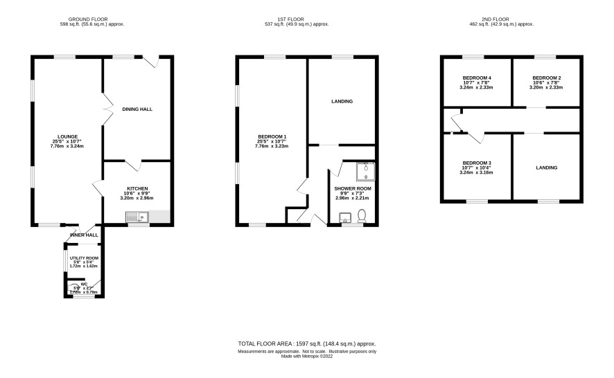 Landing area, three bedrooms.
