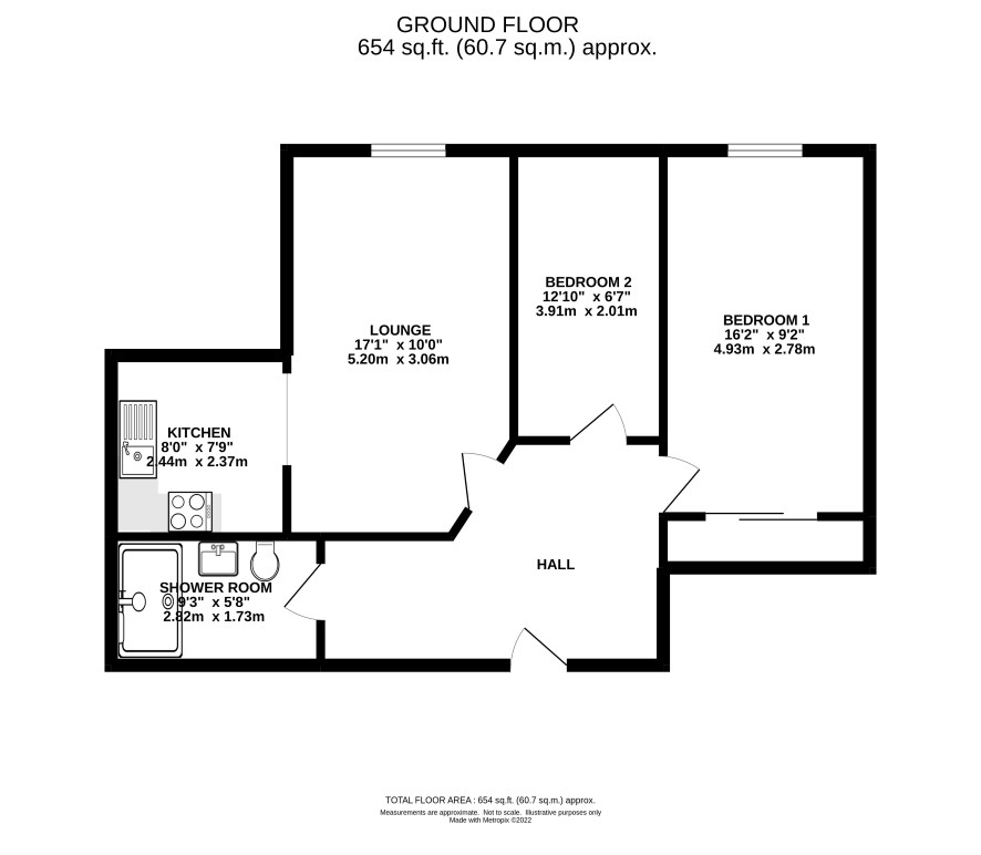 Hall, lounge, kitchen, two bedrooms, shower room