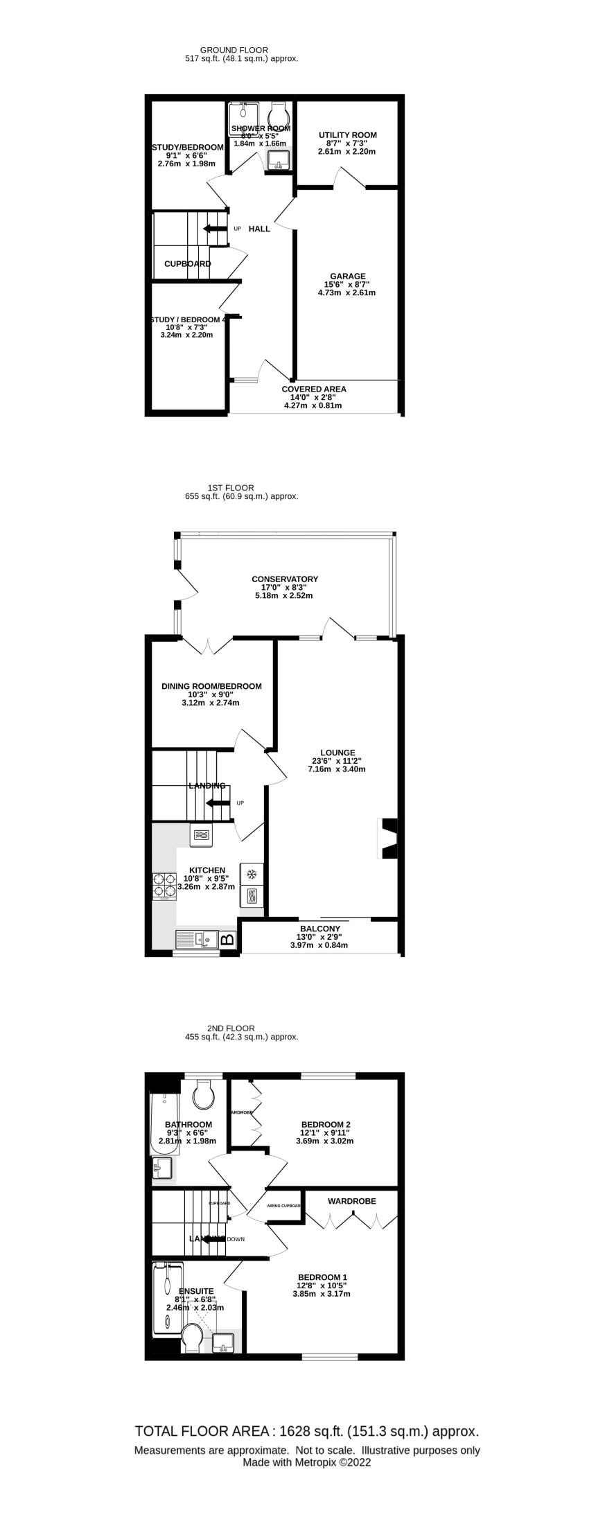 Hall, bedroom three, study/bedroom four, shower room, utility room, garage.