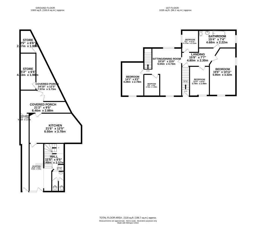 Entrance hall providing stairs to first floor landing, three bedrooms, bathroom, lounge with a further two bedrooms, stairs to staff toilets.