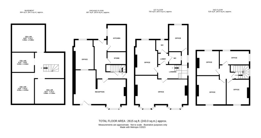 Reception and waiting area, rear office, store, kitchen, side hallway with access to large cellars
