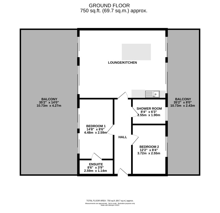 Hall, lounge/kitchen, master bedroom with en-suite shower, second bedroom and a shower room. Two external balconies accessed via the two bedrooms and lounge/kitchen.