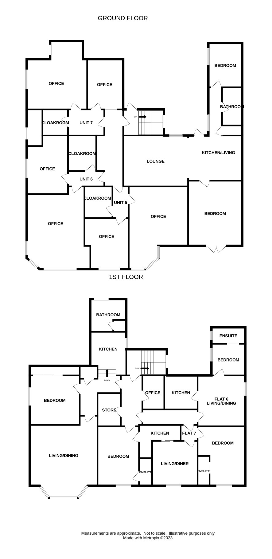Landing: office and store room. Flat 1 Hall, lounge, kitchen, bedroom, bathroom. Flat 2: Hall, lounge/kitchen, two bedrooms (one en-suite), bathroom. Flat 3: lounge, kitchen, bedroom, bathroom.