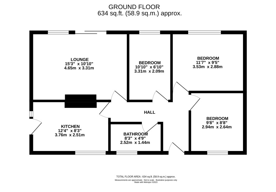 Hall, Lounge, kitchen/breakfast room, bathroom, three bedrooms.
