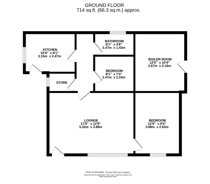 Lounge, kitchen, bathroom, kitchen, two bedrooms, store room.