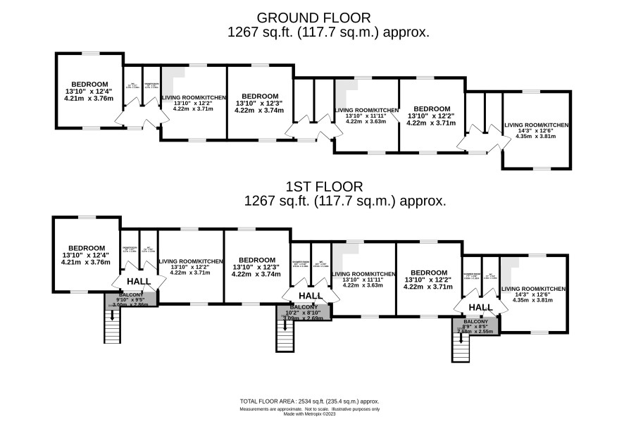 Three Ground and three First Floor Flats each with hall, double bedroom, lounge with kitchen area, wc and shower room.