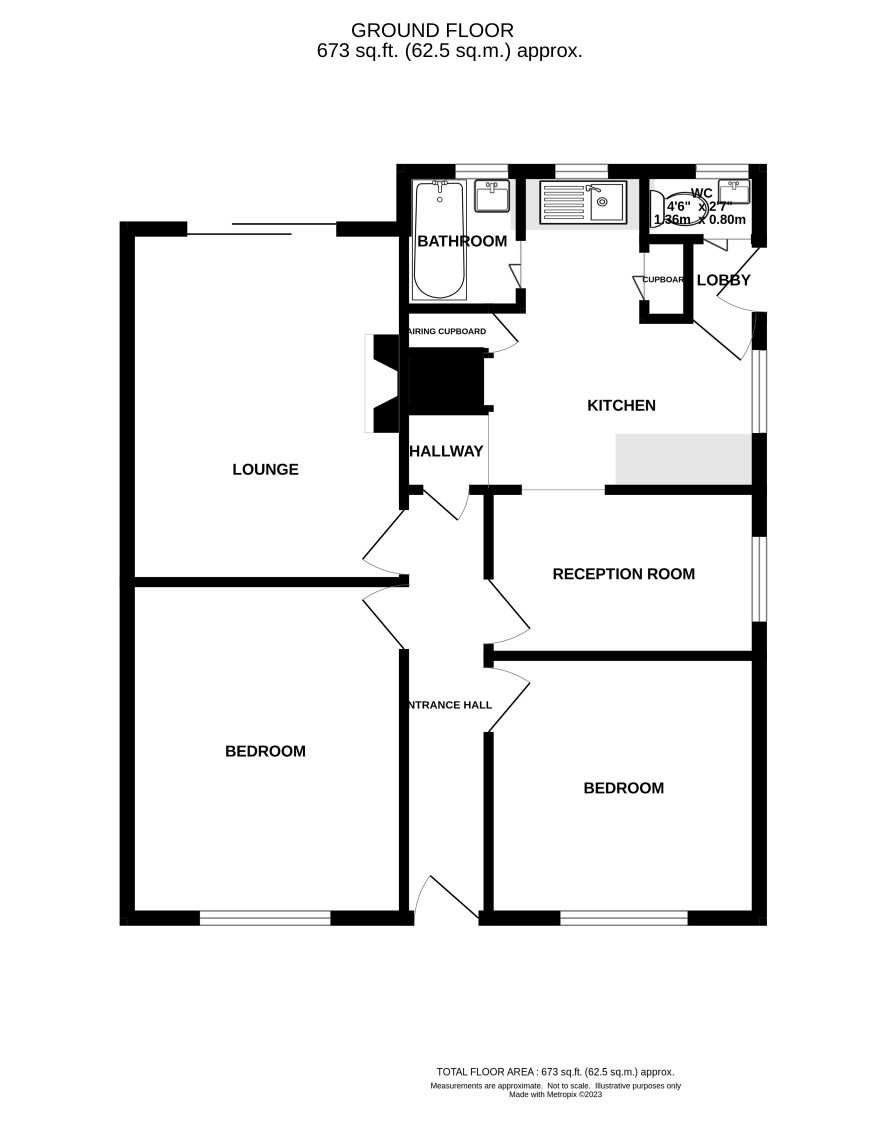 Hall, lounge, kitchen, dining area, two bedrooms, bathroom, separate w.c., rear porch.