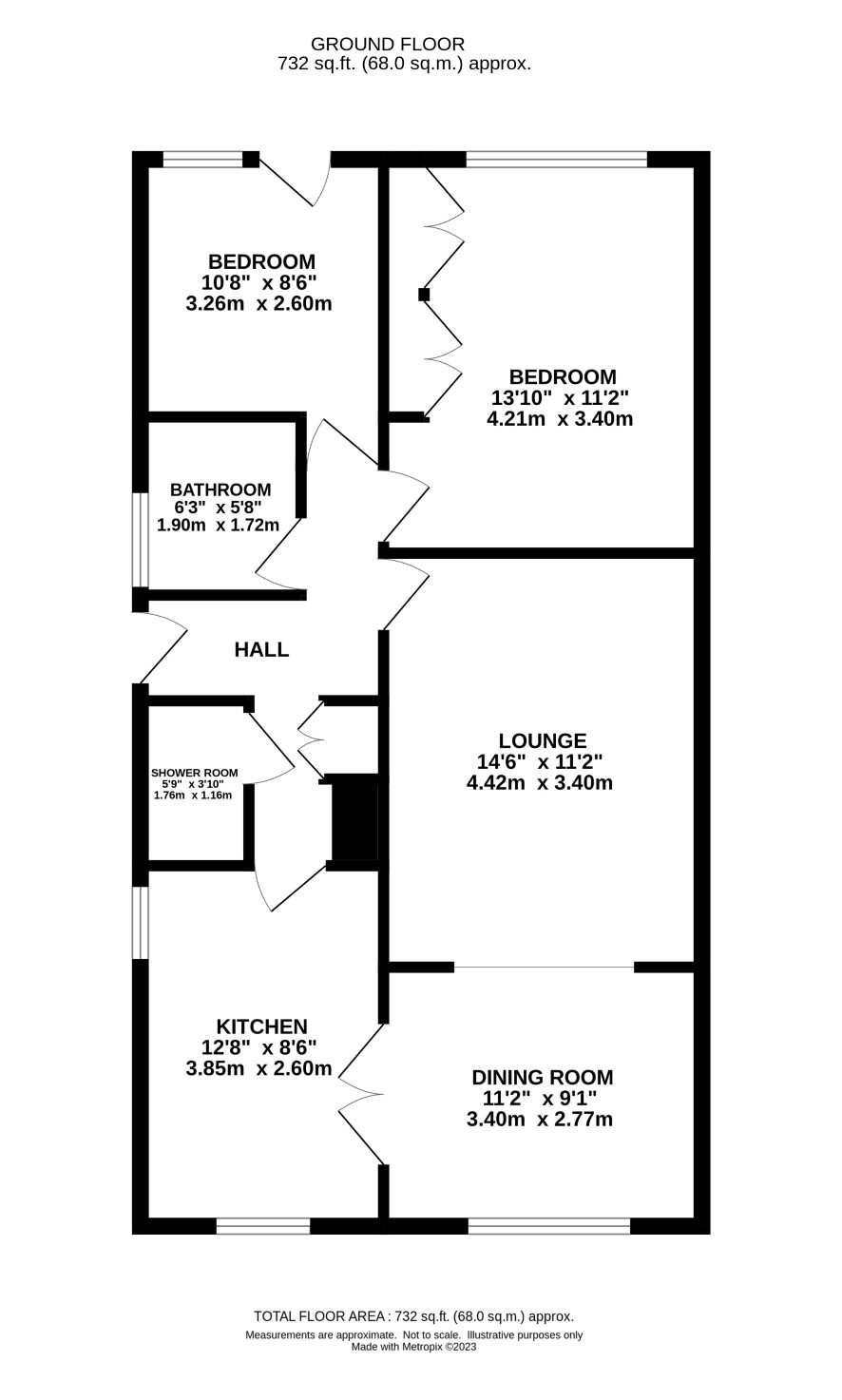 Hall, lounge, kitchen, two bedrooms, two bathrooms