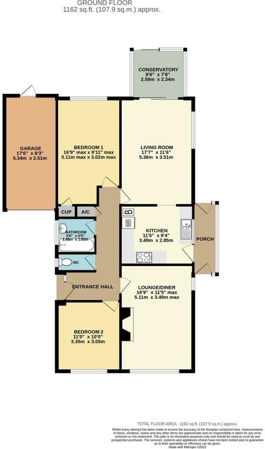 Entrance hall, lounge/diner, living room, conservatory, kitchen, side entrance porch, two double bedrooms, bathroom and separate WC