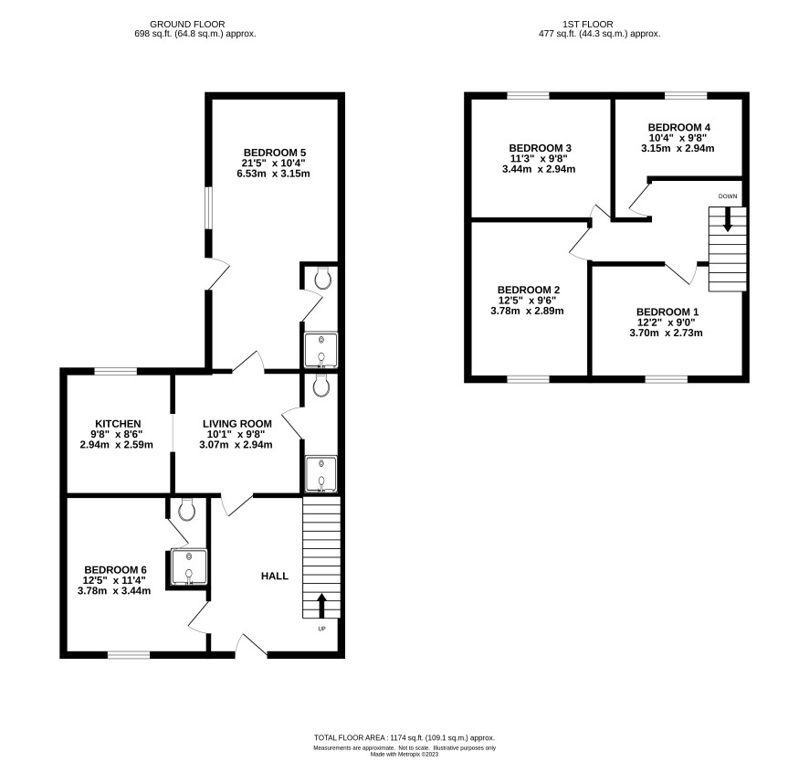 Hall, bedroom 6 with en-suite shower, bed 5 with en-suite shower, shower room, living room and a kitchen