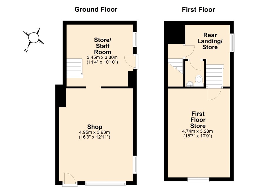 Shop and store/ staff area to the ground floor. On the first floor is a landing/store, w.c and store.