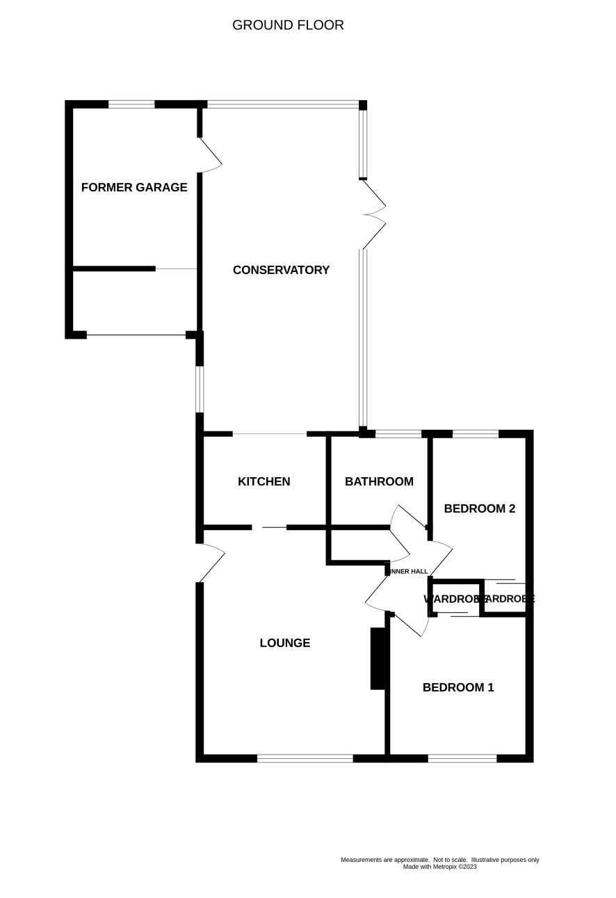 Lounge, kitchen, conservatory, two bedrooms, bathroom, former garage