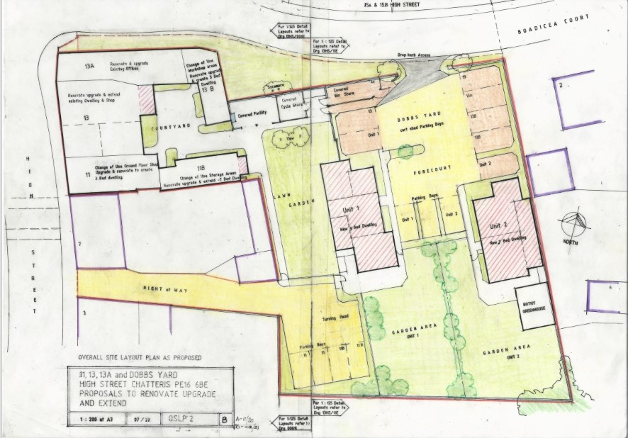This development site of 0.5 acres (stms) is located in the High Street with a conversion of existing listed buildings into one four bedroom unit, two three bedroom units and a two bedroom unit, an integrated shop unit within number 13, offices with potential flat over in 13a, plus two detached three bedroom dwellings within Dobbs Yard. Planning Permission has been granted by Fenland District Council – Ref F/YR20/0780/F, plus Grade II Listed Building Consent Ref – F/YR20/0795/LB. The development includes for courtyard areas and gardens plus parking and garages. A new access has been approved by the Council and Highways on the north side into Dobbs Yard. The successful buyer will share the Overage Costs with the seller. Chatteris is a market town with a variety of shops and schools with rail links at Huntingdon, Ely and March providing connections to London and countrywide.