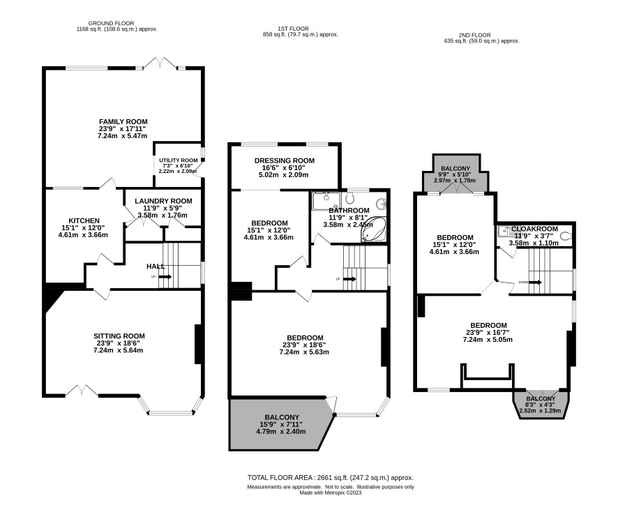 Landing, suite of rooms currently used as a sitting room, hobby room and rear balcony. Cloakroom.