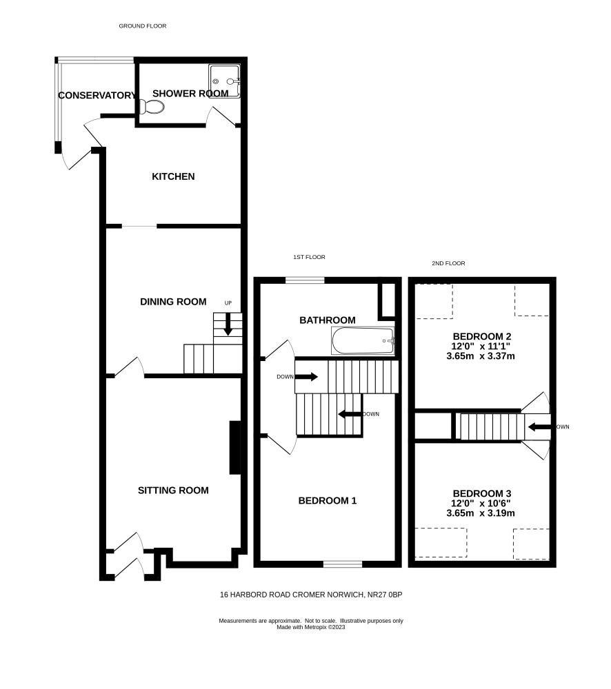 Ground floor: kitchen/living/dining room, cloakroom First floor: Two bedrooms, bathroom and study Second Floor: Principal bedroom with ensuite. Garage, parking and courtyard garden