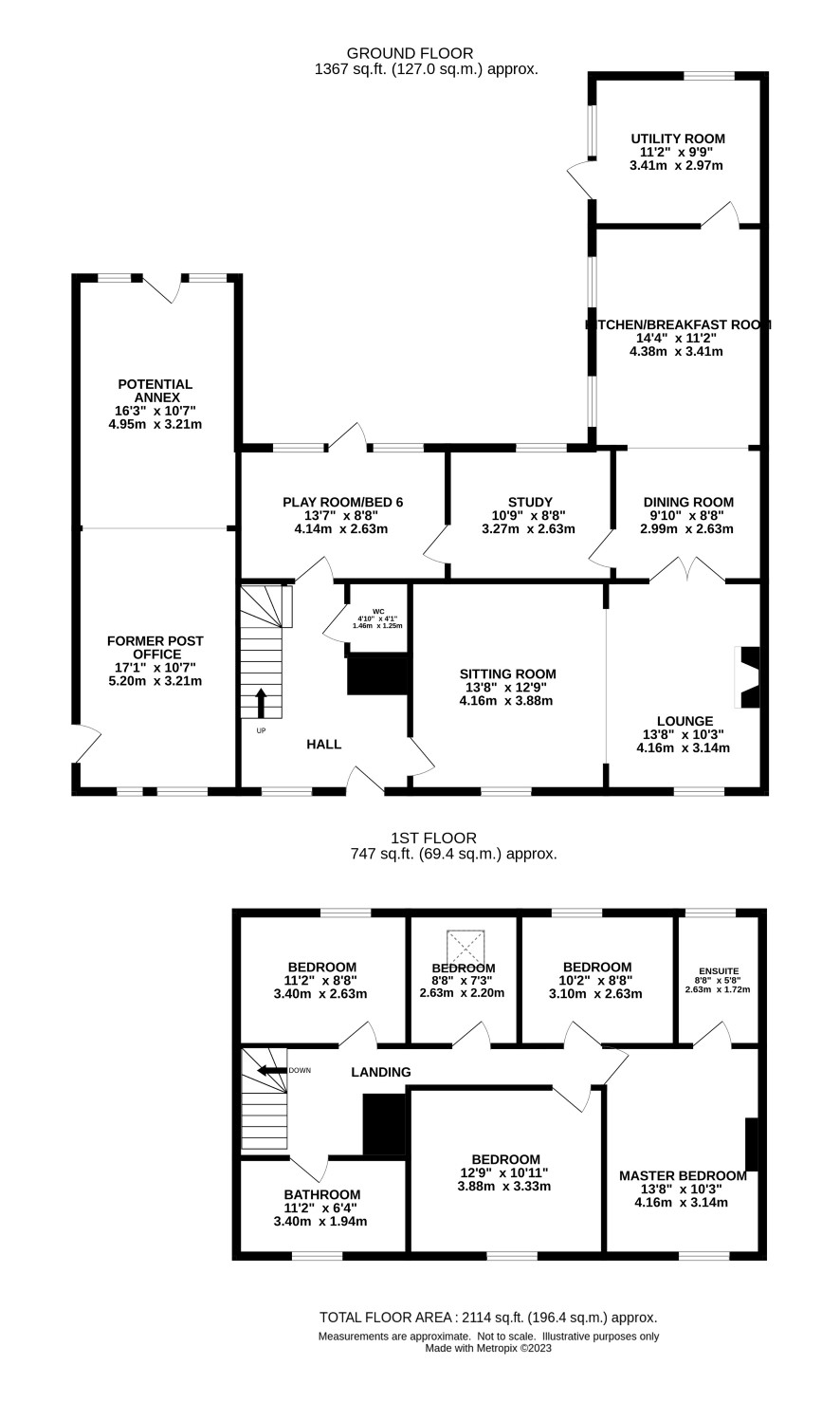 Hall, cloakroom, sitting room, kitchen/breakfast room, dining area, playroom, study/bedroom six, utility room.