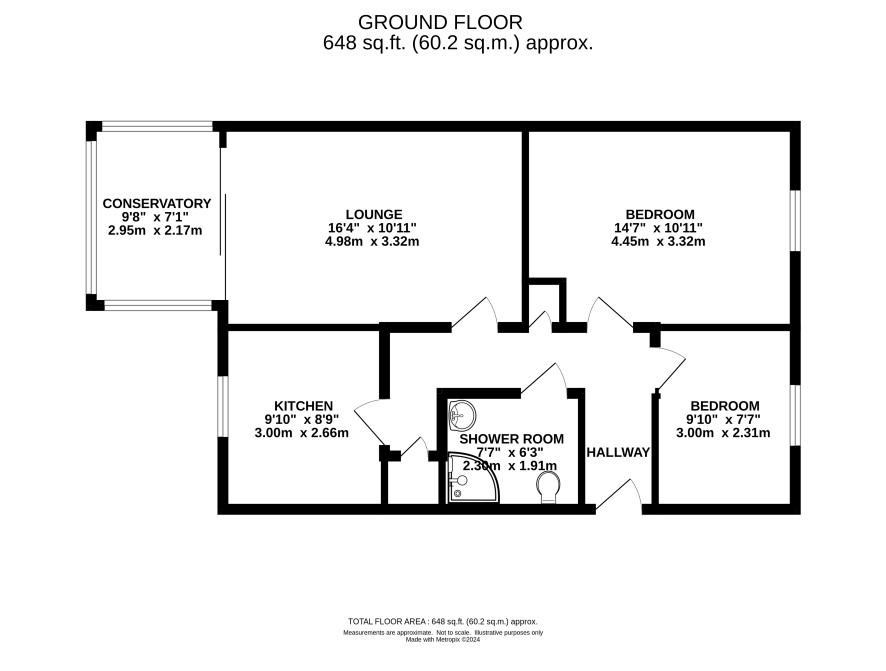 Entrance hall, two bedrooms, shower room, kitchen, lounge, conservatory