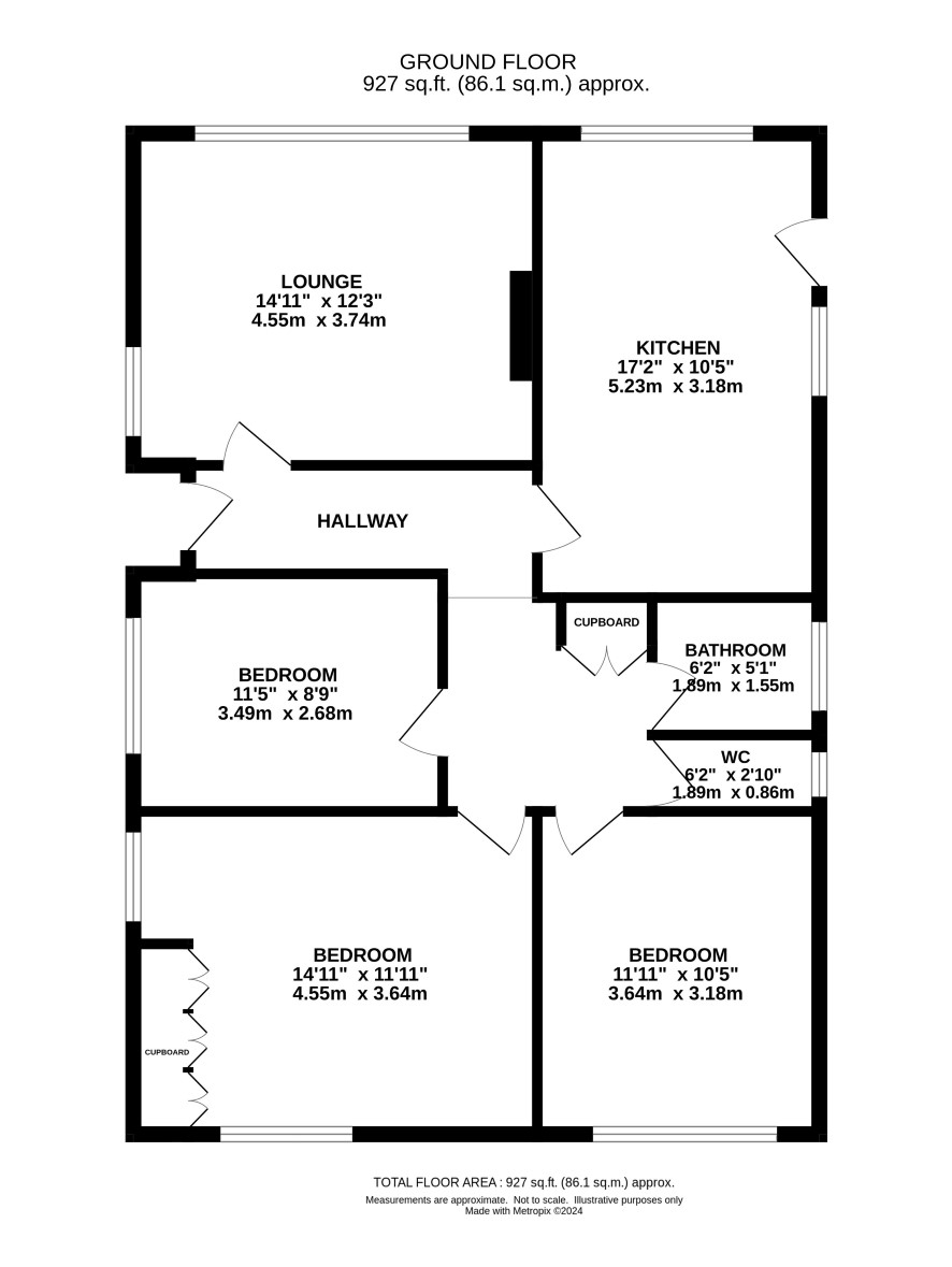 Entrance hall, lounge, kitchen, three bedrooms, bathroom, wc