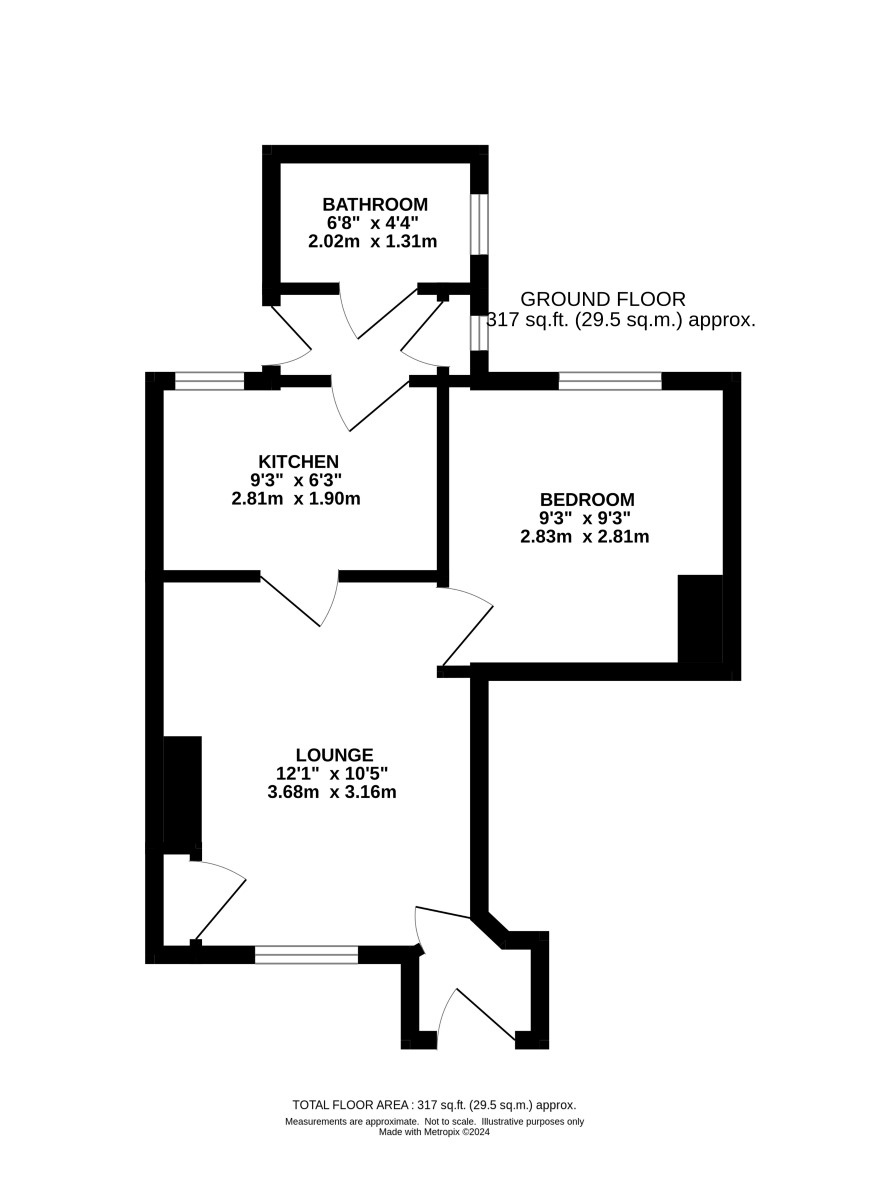 Entrance, lounge, bedroom, kitchen, bathroom