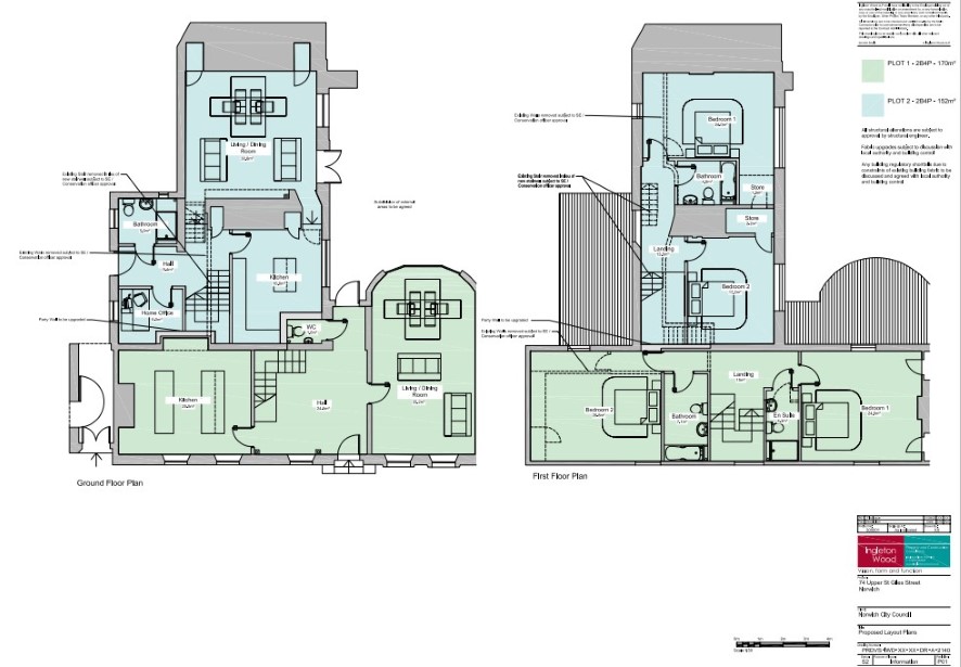 Plot 1 (170 sq/m) Ground floor: Entrance hall, kitchen, living/dining room First floor: Landing, bedroom with ensuite, bedroom, bathroom Plot 2 (152 sq/m) Ground floor: Entrance hall, home office, bathroom, kitchen, living / dining room First floor: Landing, two bedrooms, bathroom