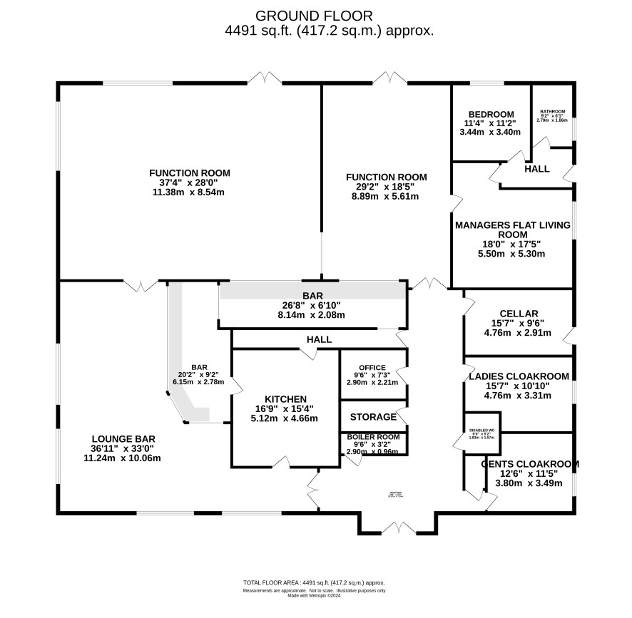 Reception areas, main bar and lounge, second bar and divisible function room, professional kitchen, male and female customer toilets, cellar. Managers flat with large living room/kitchen, double bedroom, bathroom.
