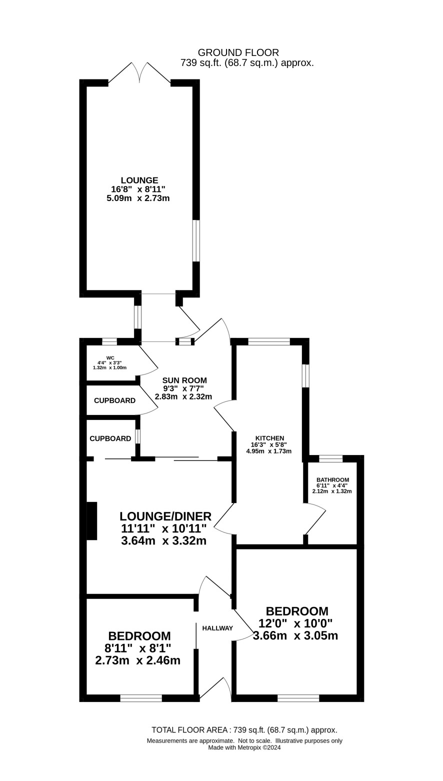 Entrance hall, two bedrooms, dining room, kitchen, bathroom, lounge, sun room