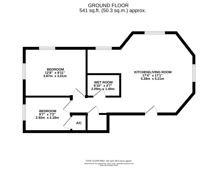 Open plan living area/kitchen, hall, two bedrooms, wet room