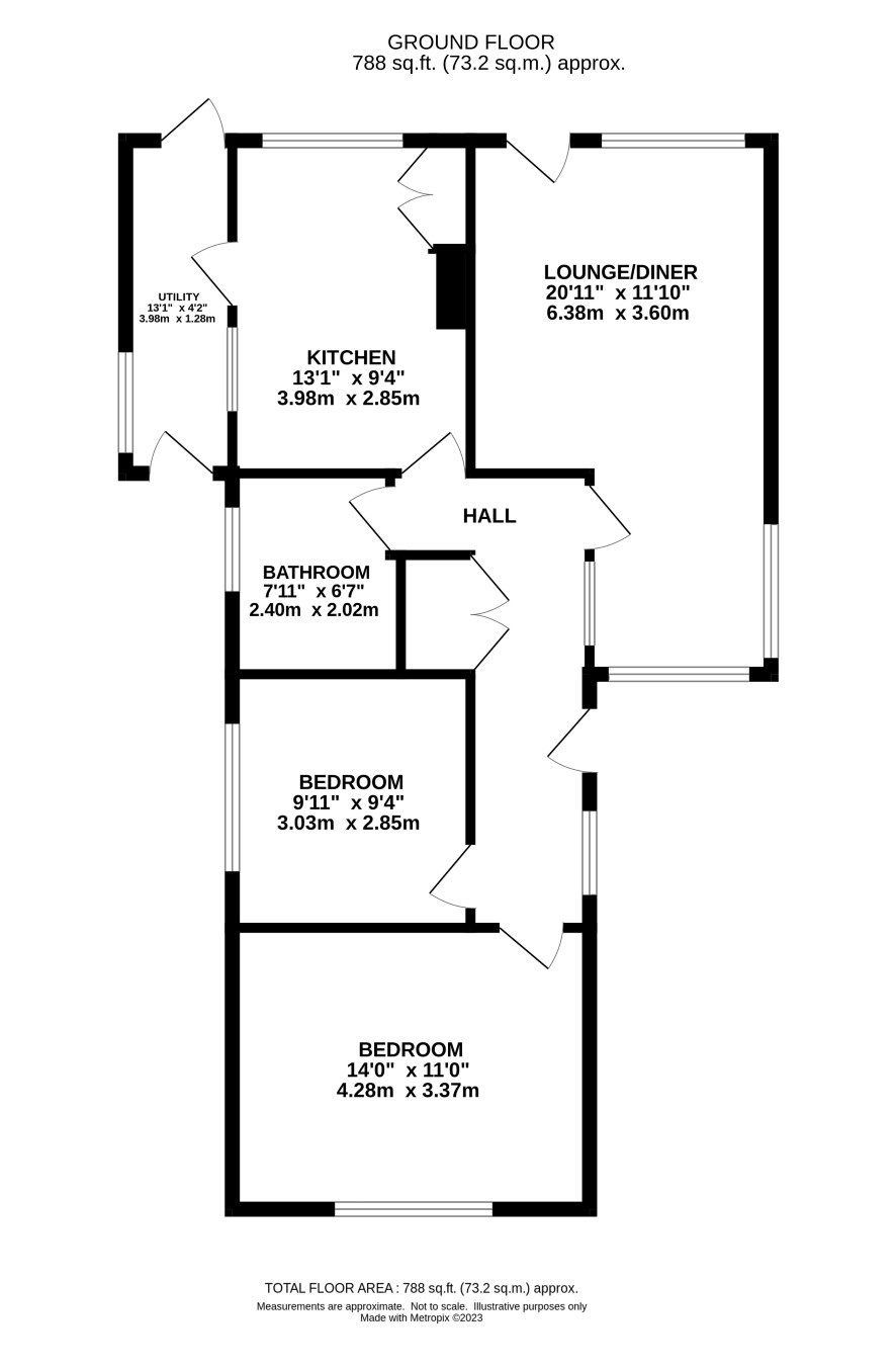 Hall, lounge/dining room, kitchen, two bedrooms, bathroom