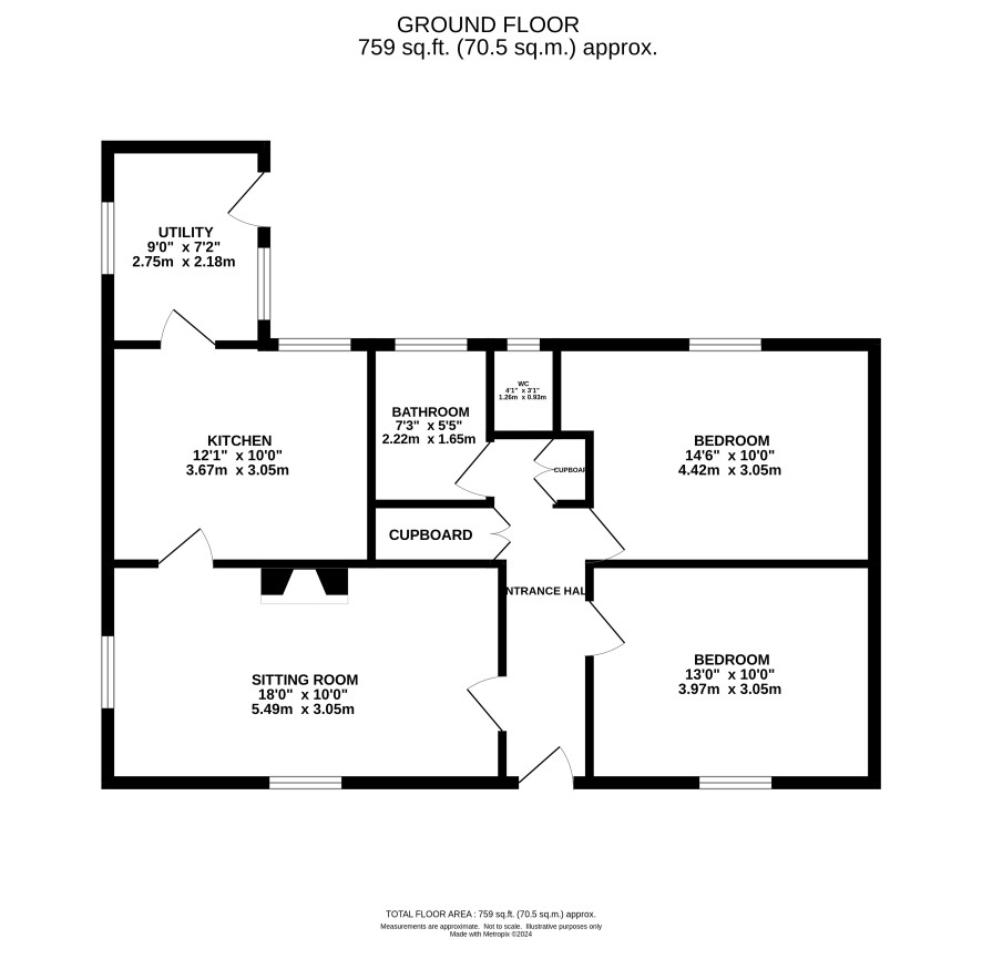 Entrance hall, sitting room, kitchen, utility, two bedrooms, bathroom, wc