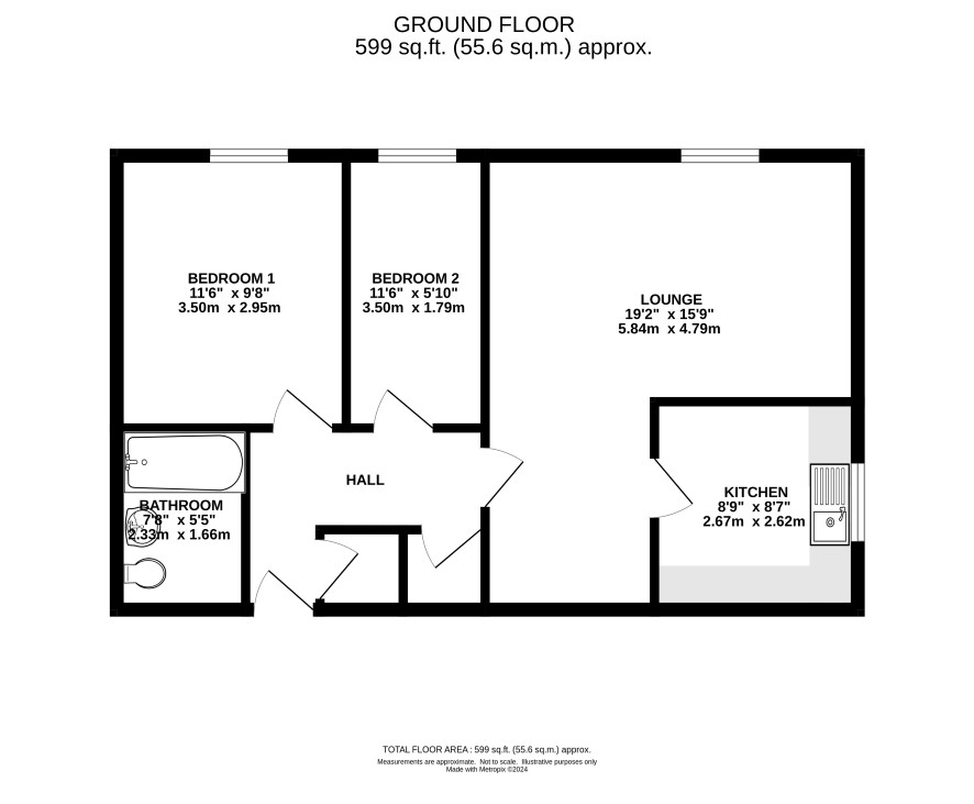 Hall, living room, kitchen, two bedrooms and a bathroom.