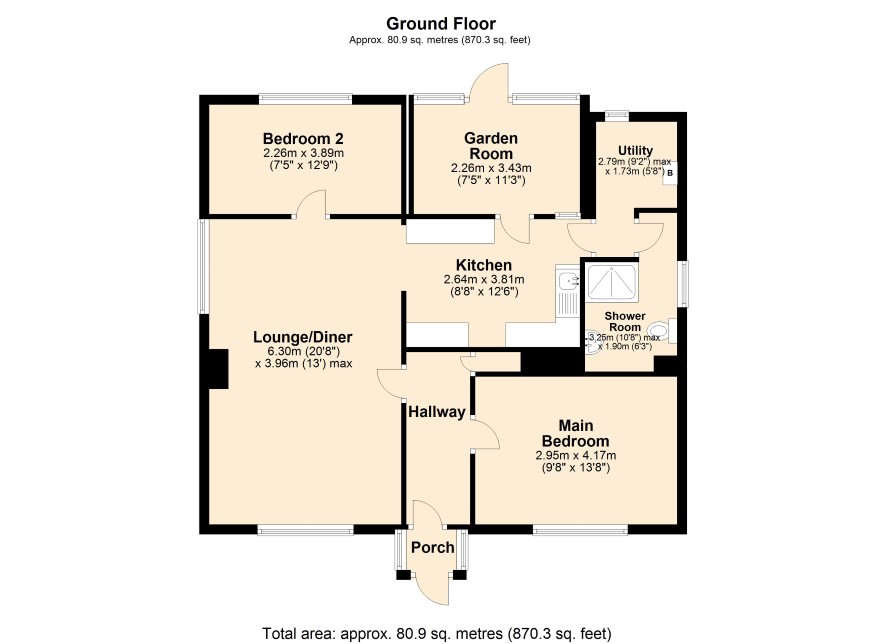 Entrance porch, hall, bedroom, lounge/diner, bedroom, kitchen, shower room, conservatory