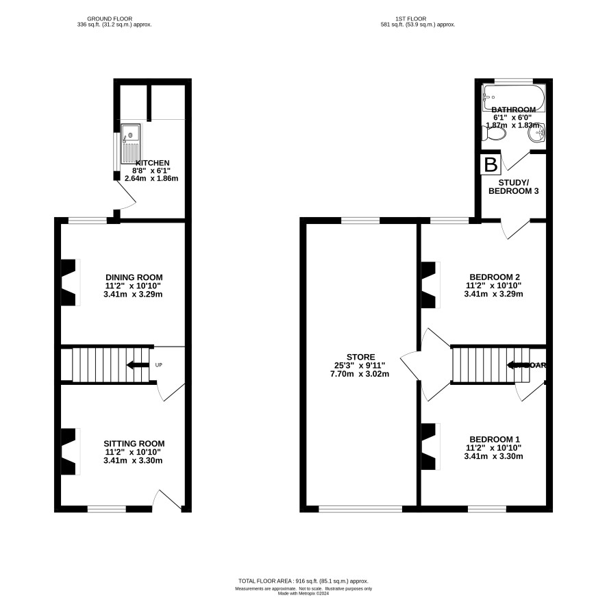Two double bedrooms, study/third bedroom, bathroom, large store room with scope for further living space (STPP)