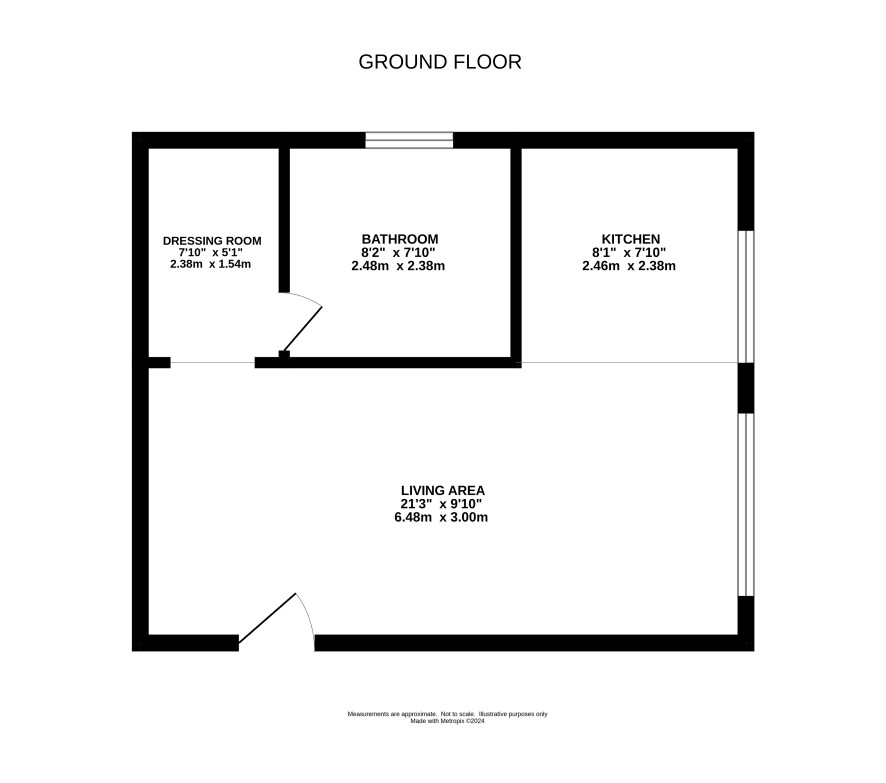 Living area/bedroom, kitchen, dressing room, bathroom