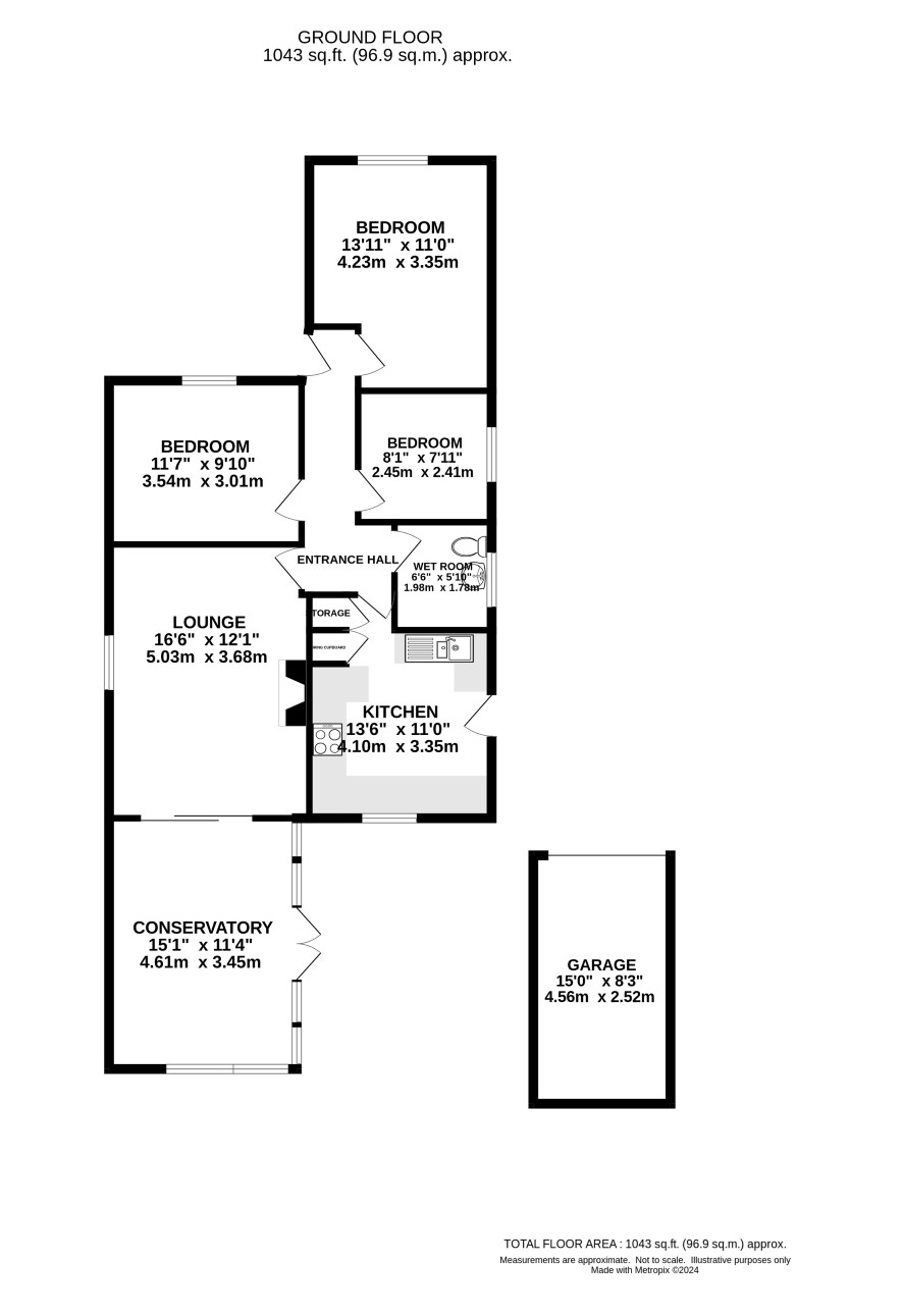 Entrance hall, sitting room, generous conservatory, kitchen, three bedrooms, wet room.