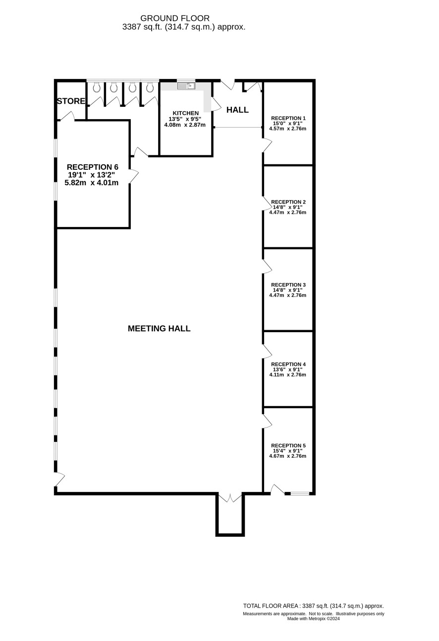 Hall, meeting room, six further rooms, kitchen and four toilets. Gross internal area of 349.24 sq m.